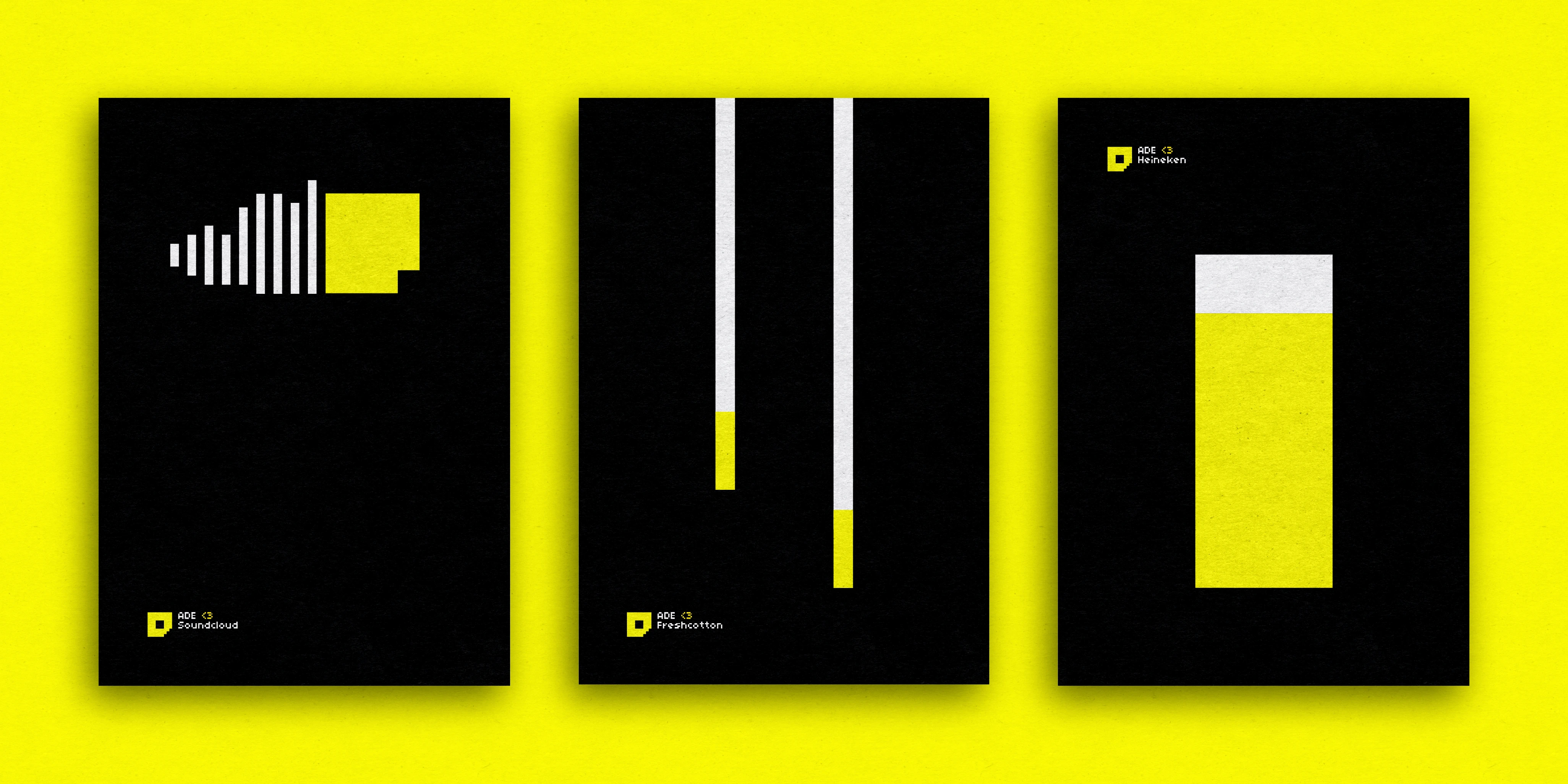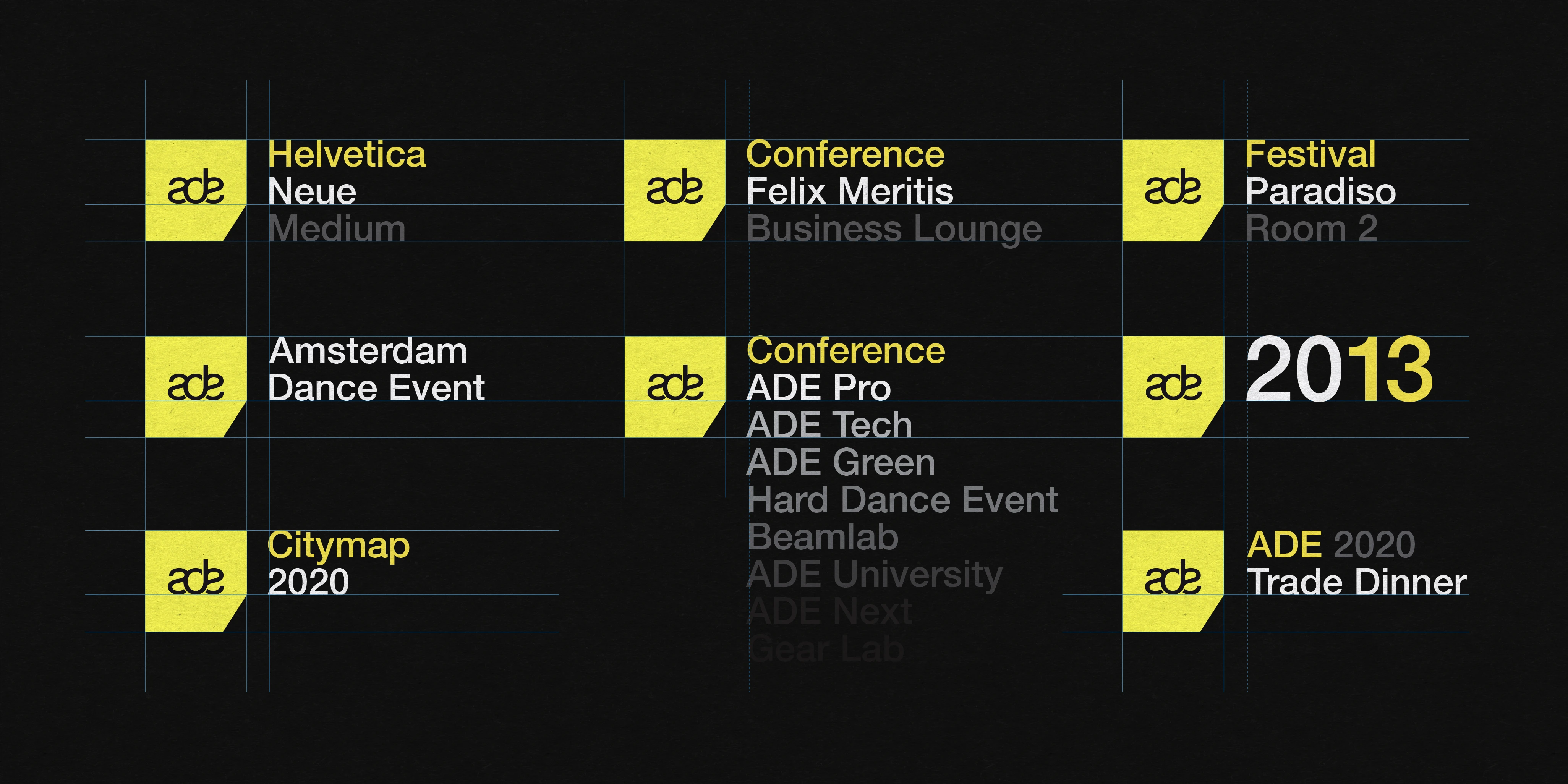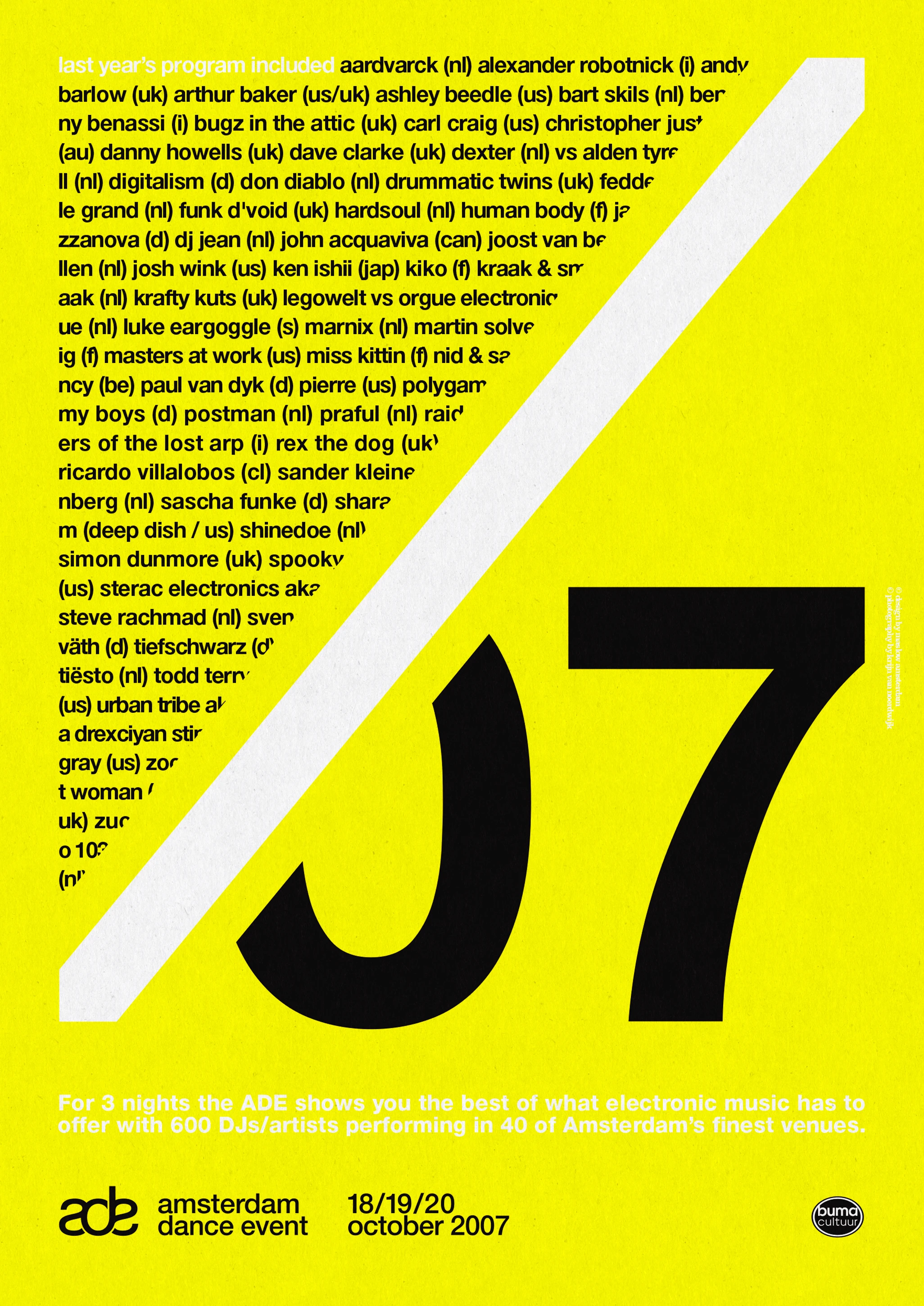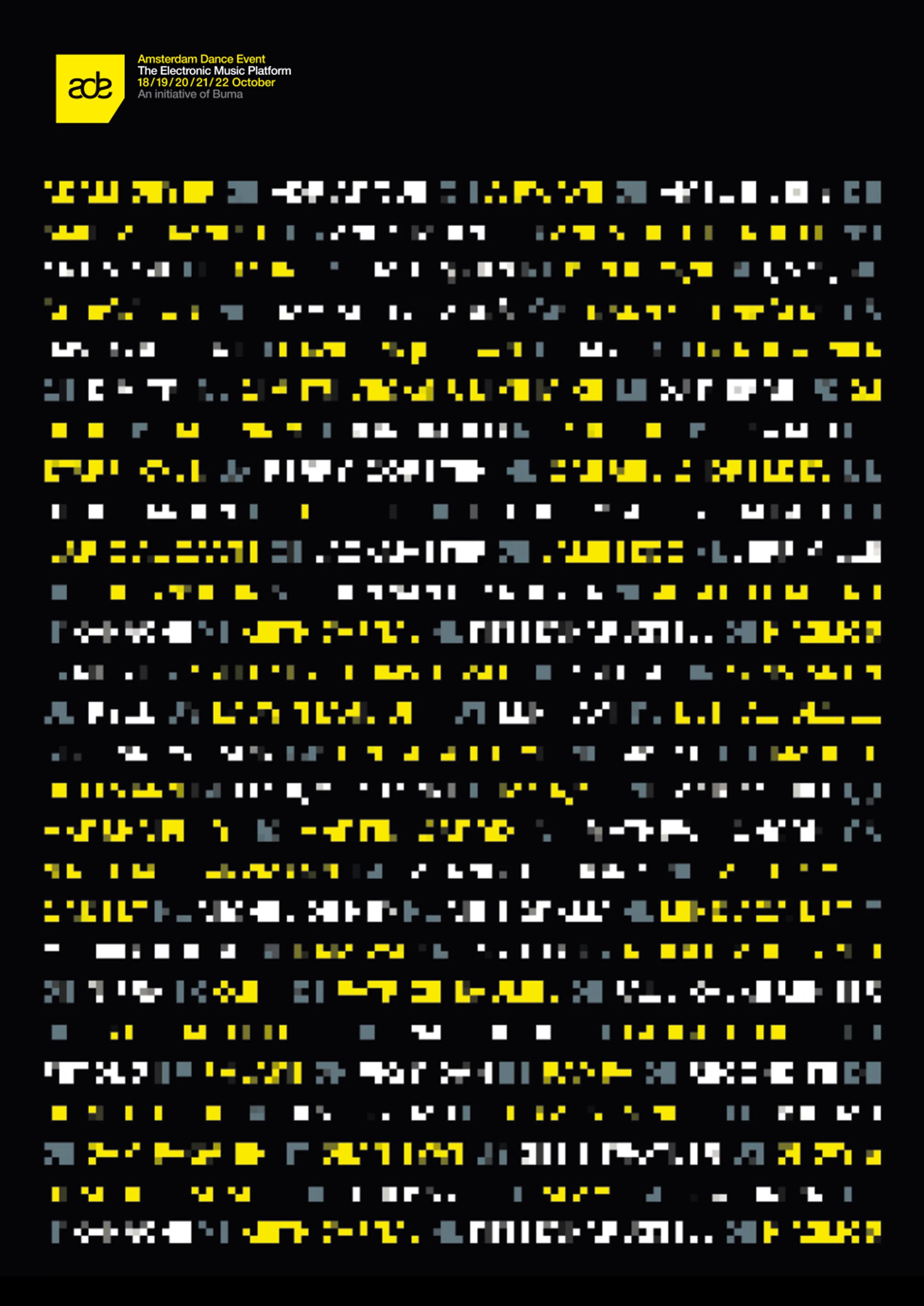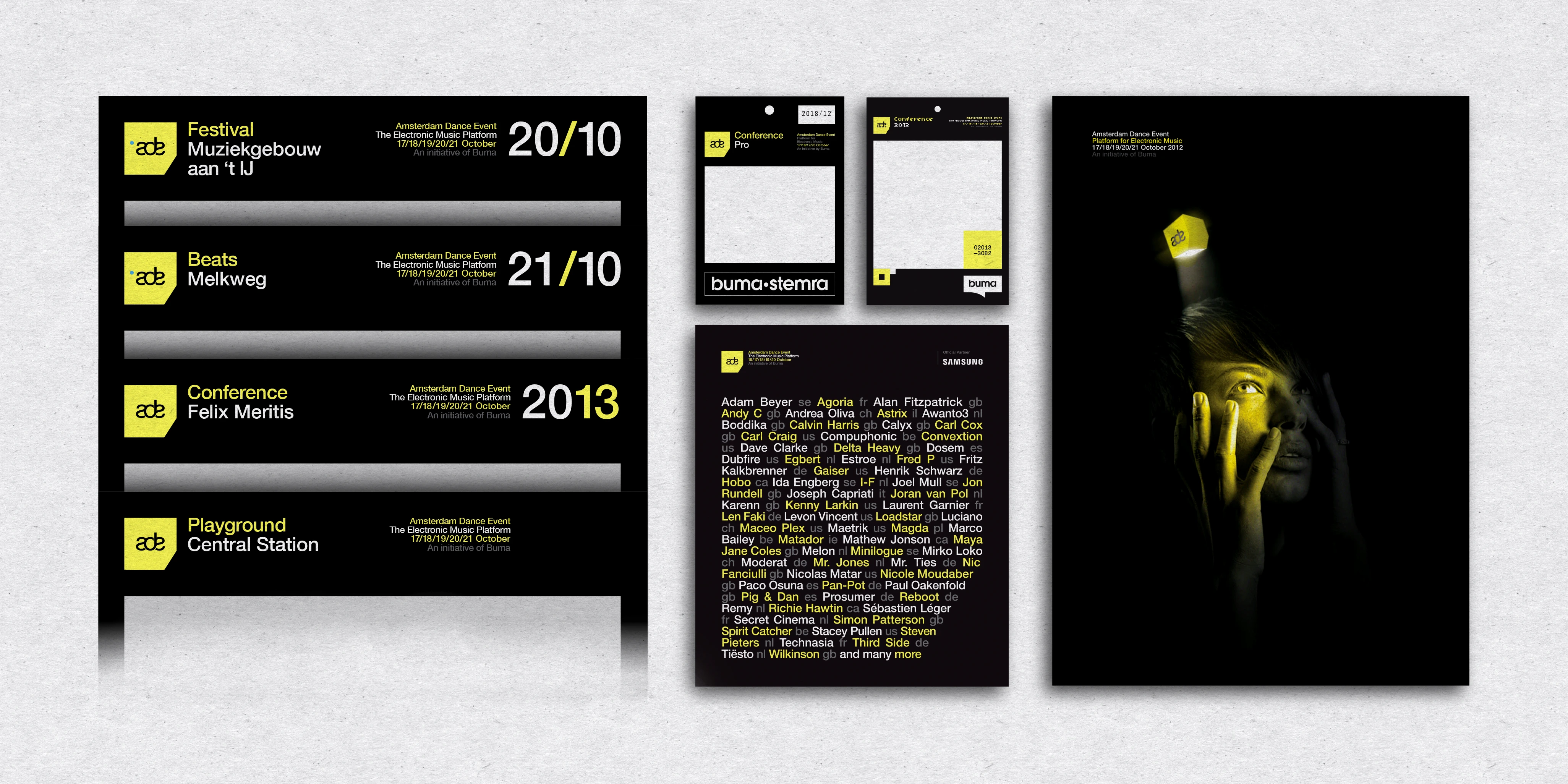 Ever since taking over ADE from the legendary Niels 'Shoe' Meulman (Caulfield & Tensing) back in 1998 the club colours have been black and yellow and it has been the only part of the old identity that stayed untouched after implementing a much needed and more sustainable new identity in 2004. For the rest the package of ADE output has developed and changed a lot during our 22 years collaboration. From doing a poster, flyer and mini booklet in the first year to working on international campaigns, redesigning for nonstop changing digital environments and producing, designing and publishing official books in a serious run of thousands of copies. And it was the close collaboration with head honcho Richard Zijlma that made it possible. A true visionair and the best general director for an upgrowing ADE, turning it into the biggest highly unique clubfestival in the world as well as thé most essential multi-day dance conference in order to stay well informed and run a business in the electronic music scene.